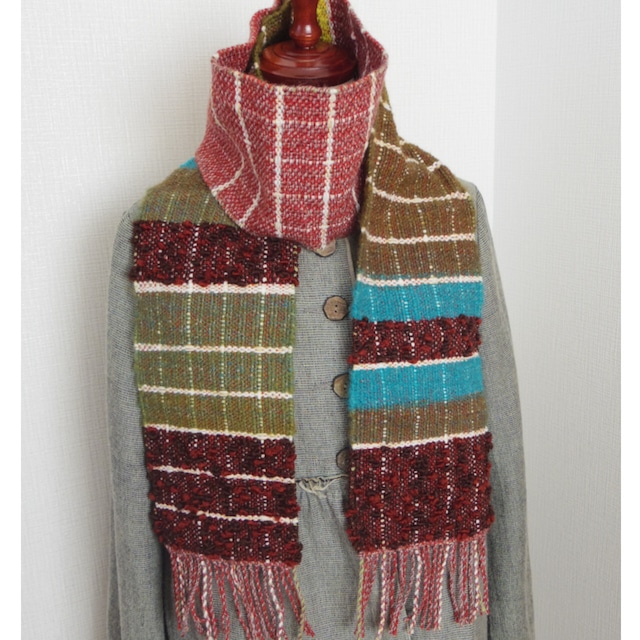 経糸はエンジと薄いグレーの毛100%の杢糸と、毛80%シルク20%混の朱色の毛糸を基本に使い、横糸に経糸と同じ毛糸、グラデーションのモヘア、ポンポン付きの毛糸などをランダムに配置しました。白の毛糸でストライプやチェック柄が浮き出ています。 裏表なくお使いいただけますが、規則的に織り方を変えてアクセントになるよう織ったので裏表違う糸の柄になります。 グラデーションも、巻き方によって見え方が違くなるように仕立てました。 長さはフリンジを含まない本体が165cmあるので、2重にして結んでいただける長さです。 寒い冬のあったかアイテム、不思議な彩どりのマフラーはいかがでしょうか。 お洗濯はクリーニングをお勧めしますが、お家でお洗濯の場合は、おしゃれ着用洗剤などでやさしく押し洗い→平たく影干しとなります。 【素材】 毛、シルク、アクリル、ポリエステル 【サイズ】 幅16.5cm、全長181cm、フリンジ8cm
