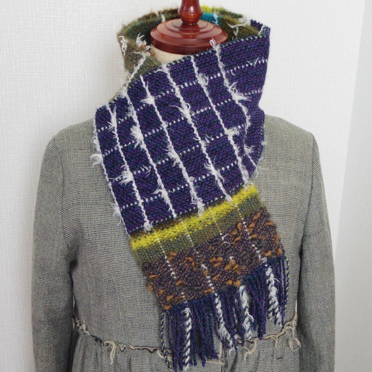 経糸はブルーベース3色の毛100%の杢糸と、毛80%シルク20%混の紫の毛糸を基本に使い、横糸に経糸と同じ毛糸、グラデーションのモヘア、ポンポン付きの毛糸などをランダムに配置しました。白の毛糸でストライプやチェック柄が浮き出ています。